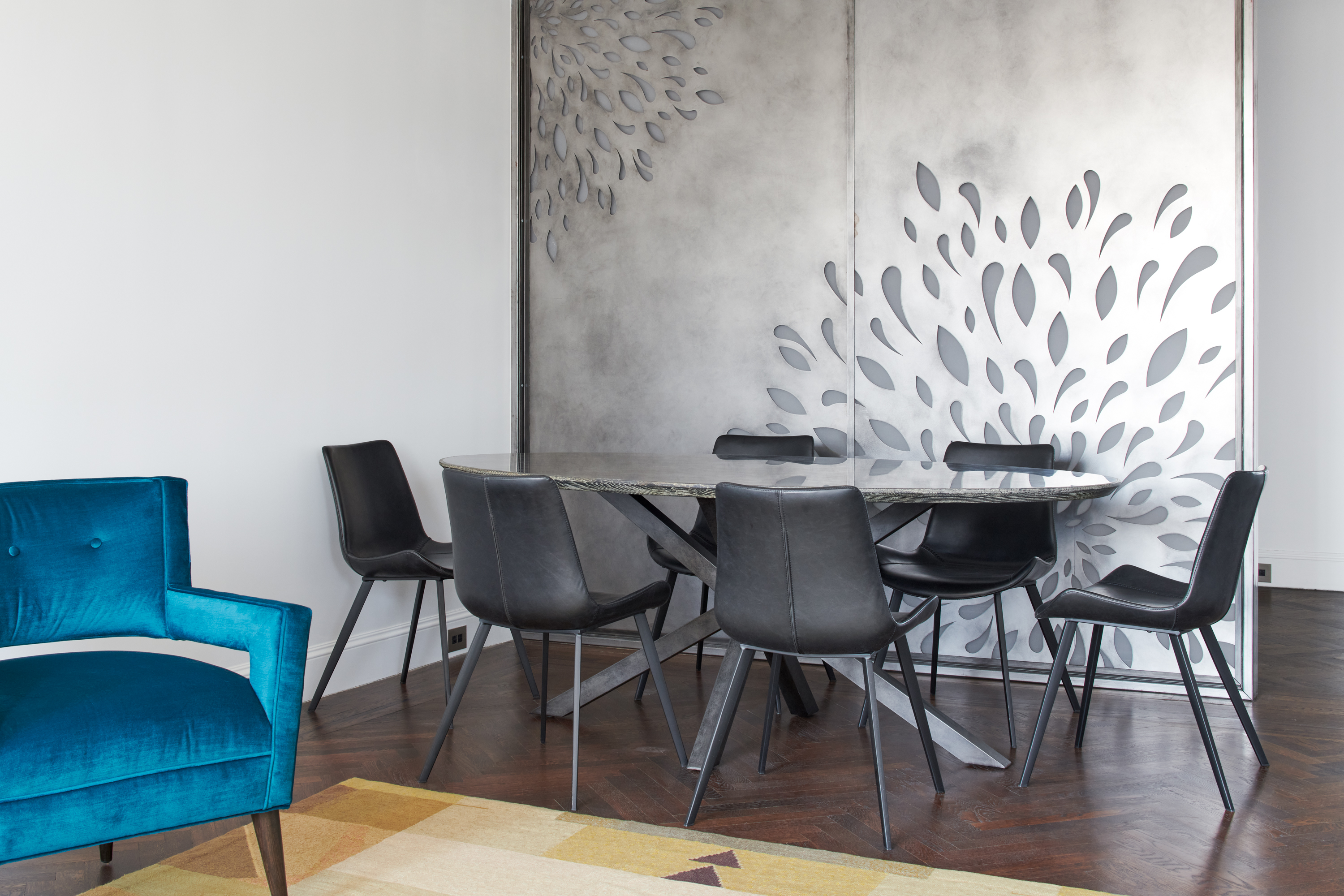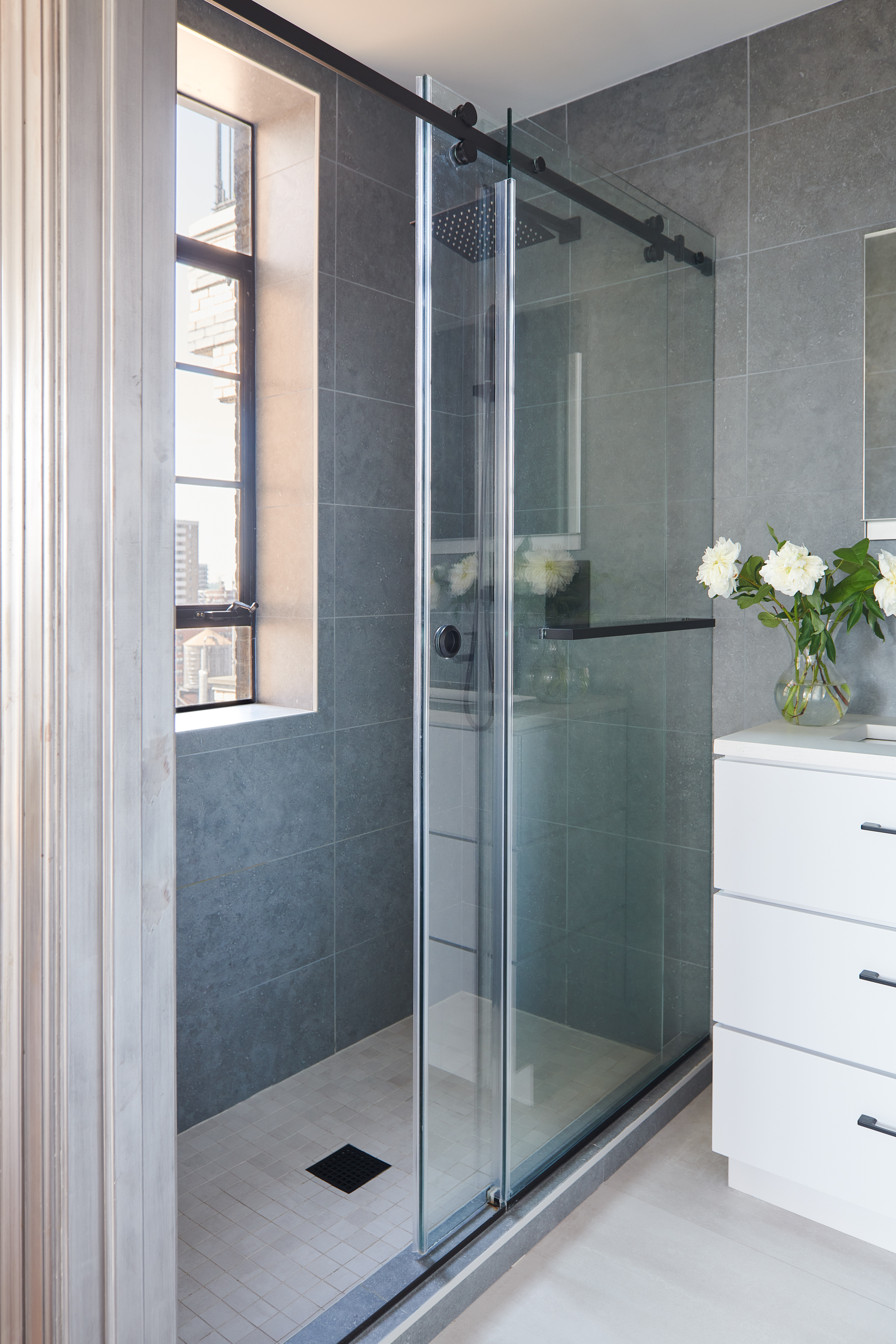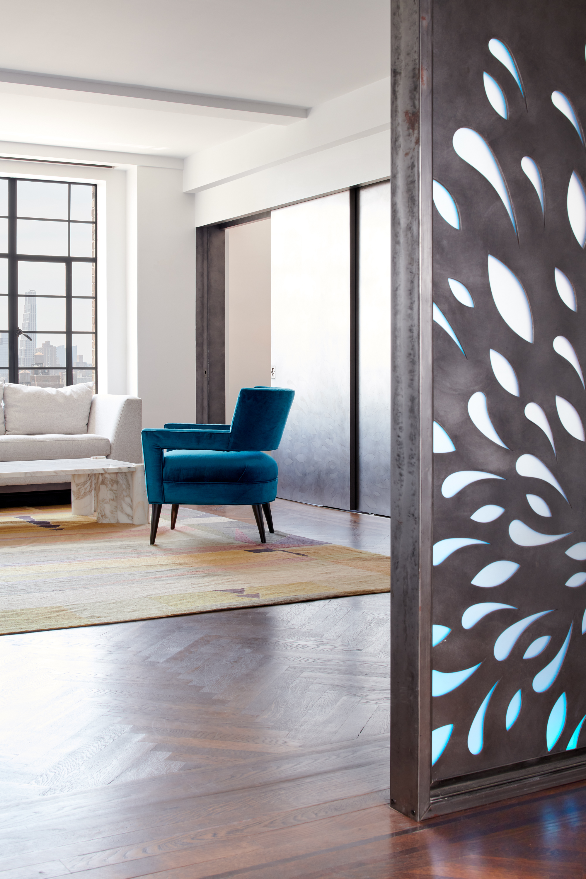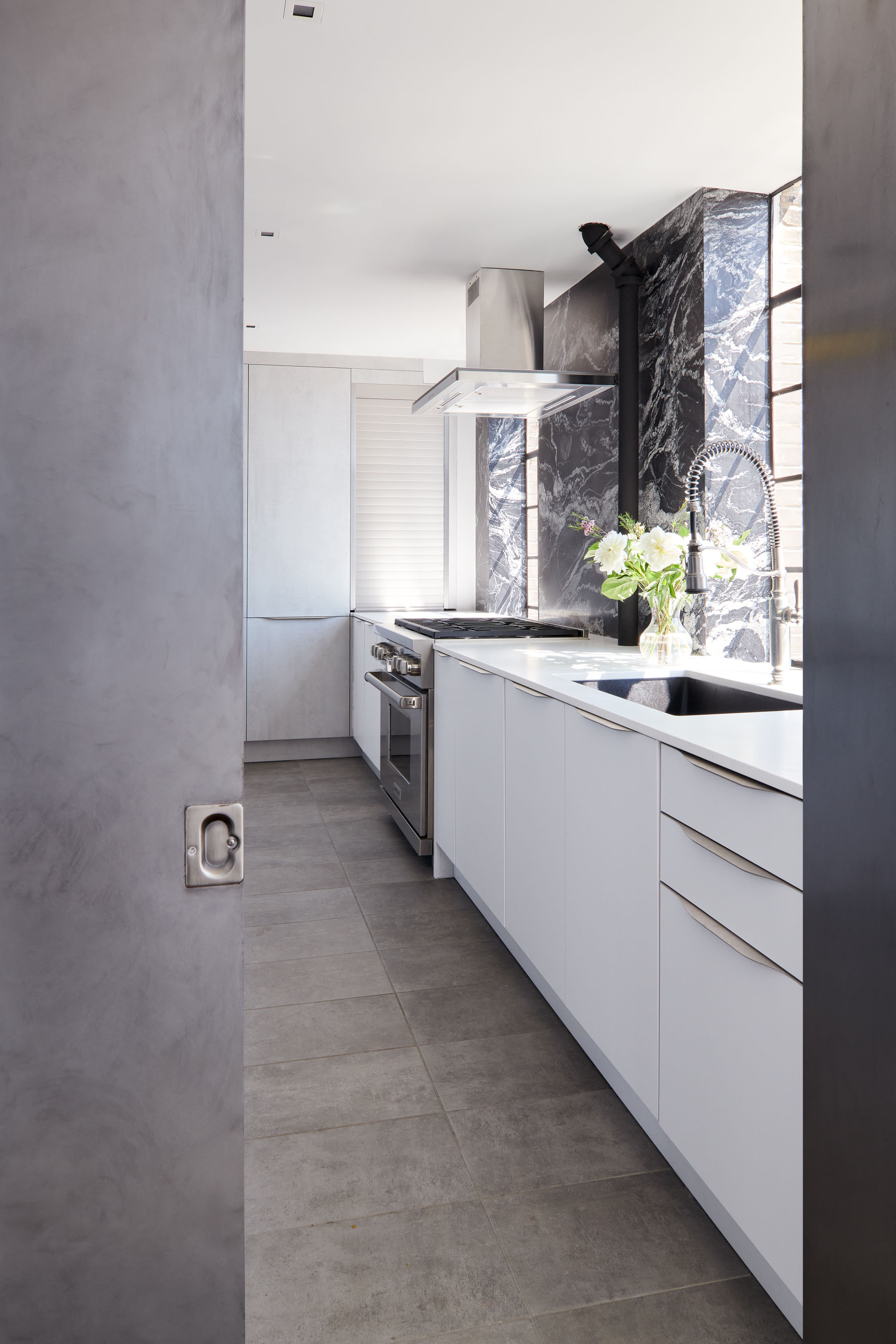 The entire kitchen and maid’s room area was opened out to create a large spacious kitchen. A new powder room/laundry room was added. A custom designed and built feature wall along the living room allows light to penetrate the entry foyer. Matching custom designed metal pocket doors open out from the living room to the kitchen and bedroom/study. Existing steel frames and doors were stripped down to expose the cold rolled steel and all existing steel casement windows were refurbished. The existing herringbone patterned wood flooring was restored.