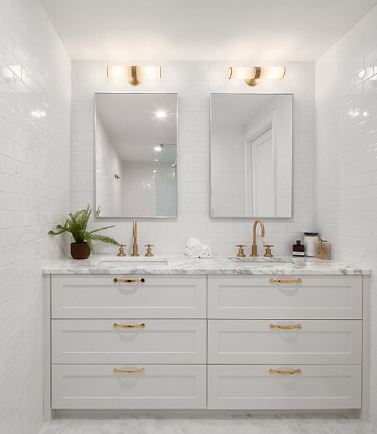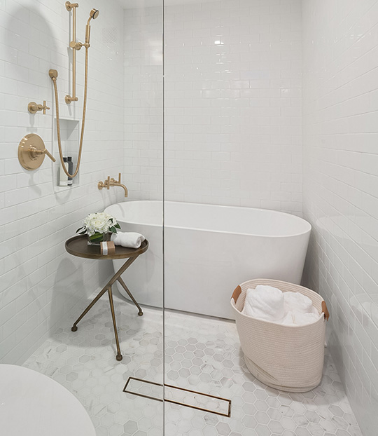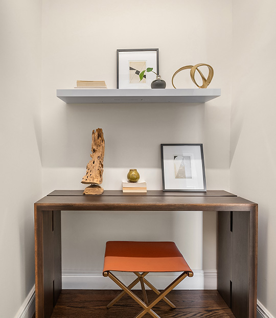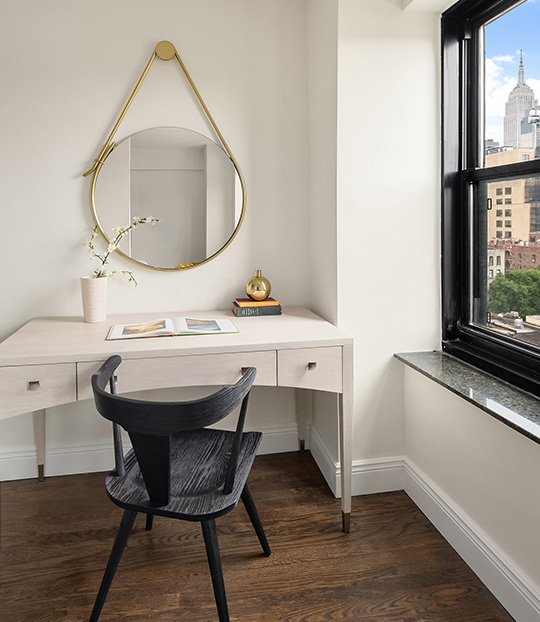 The existing studio apartment was gut renovated to include a master bedroom suite with bedroom, study area, walk in closet and master bathroom. The master bathroom includes a double vanity with walk in shower and bathtub. The area connecting the two apartments was designed to integrate seamlessly to the existing apartment through a hallway lined with floor to ceiling closets.